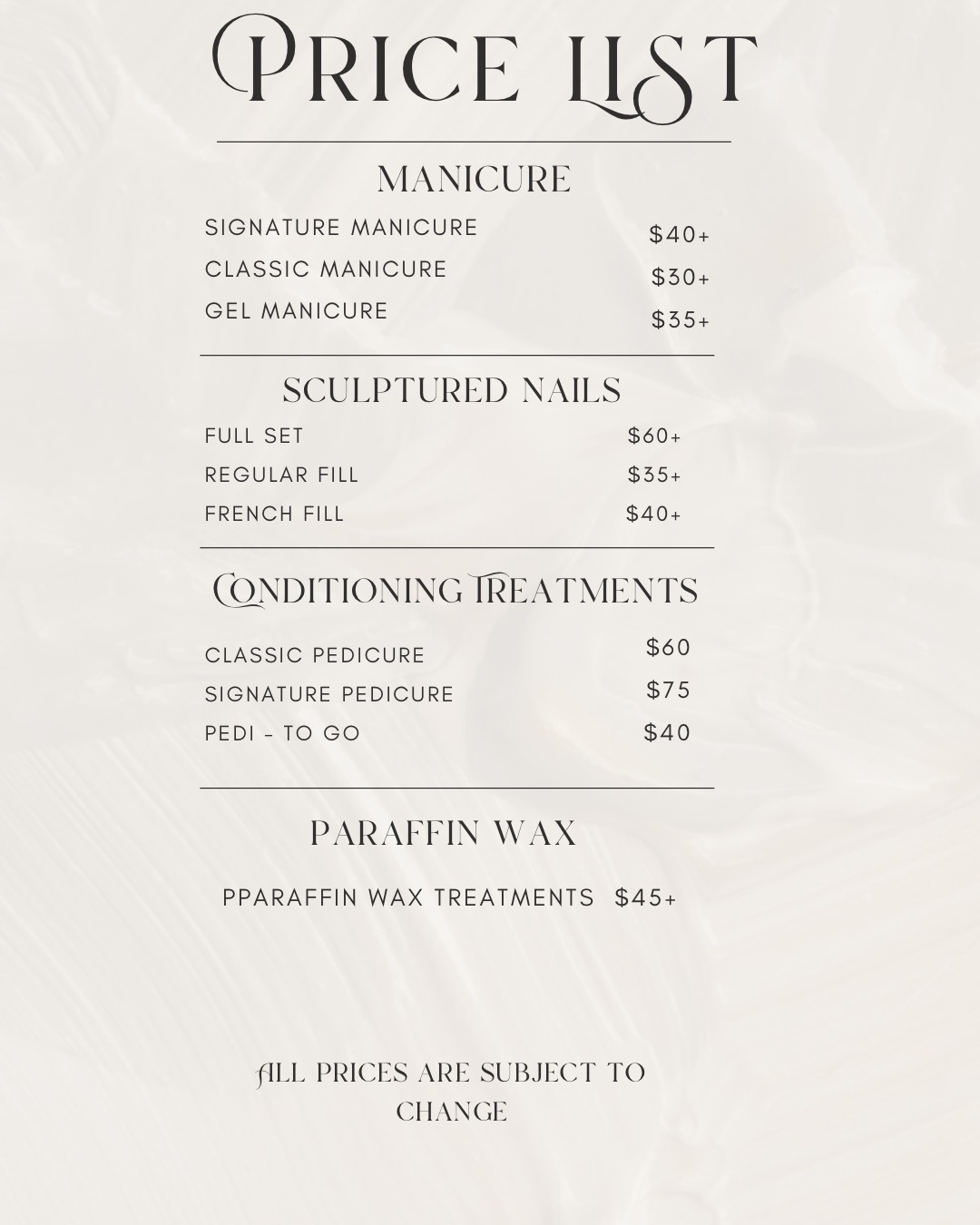 From classic to custom nail looks, our services are tailored to your style. prices may very based on nail length, art, and add ons.