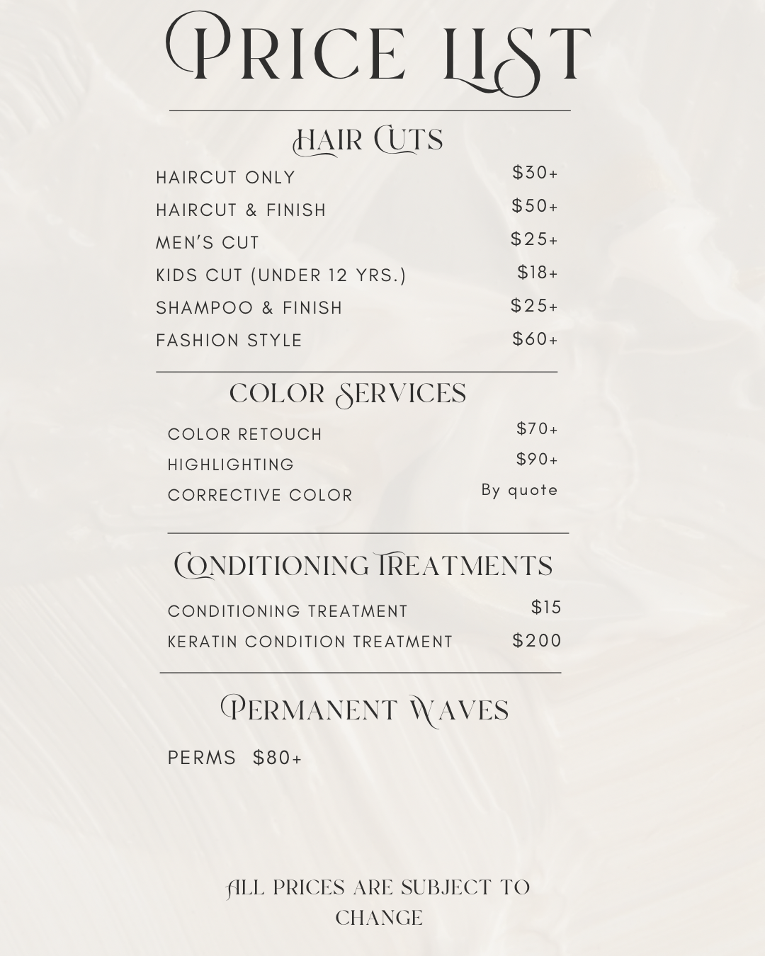 Salon Service Price List