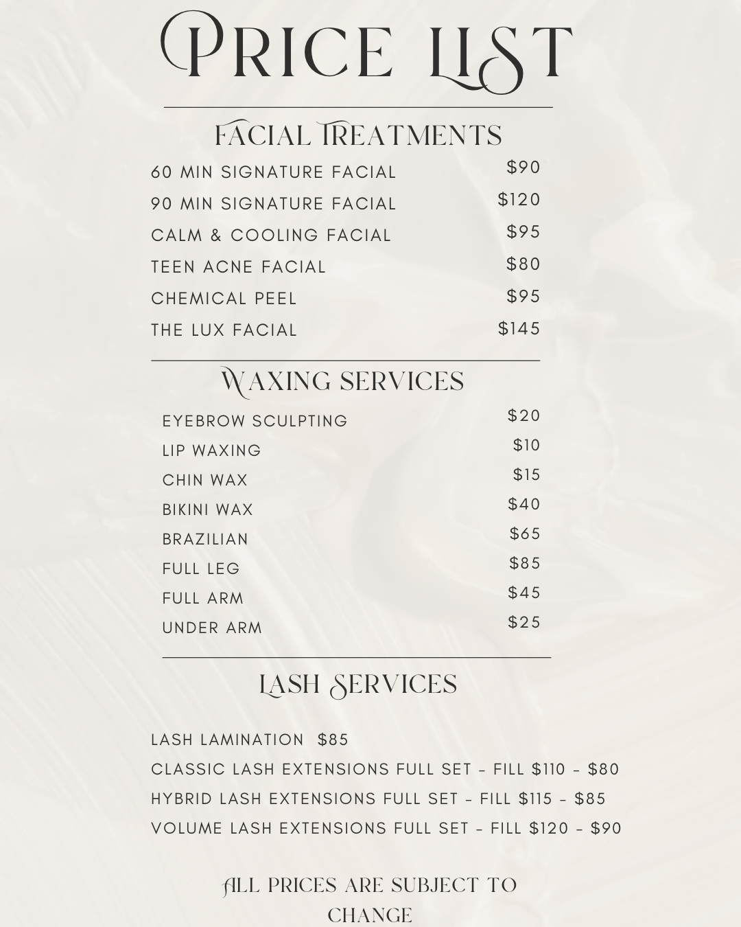 Spa Service Price List